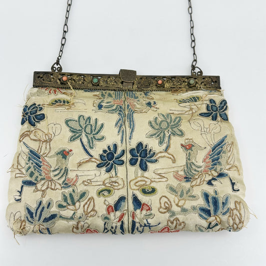 Antique Gold Gilt Chinese Silk Embroidered coral & turquoise Purse - GM811