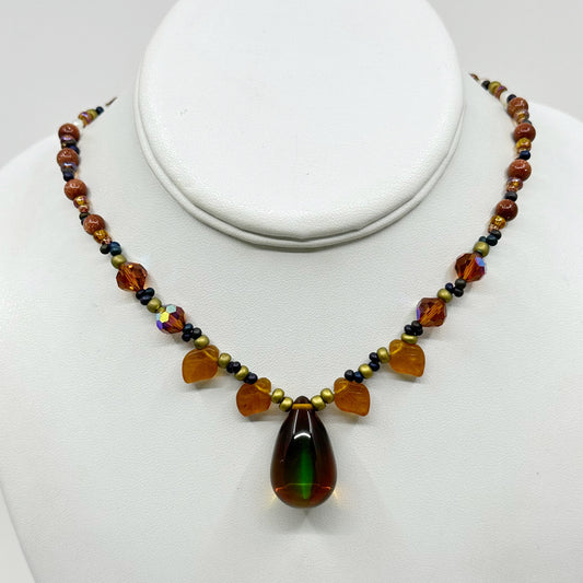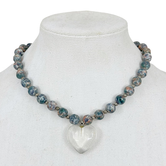 Vintage pottery bead & heart rock crystal pendant necklace