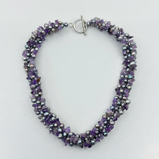 sterling silver pearl & amethyst beads torsade necklace - GM1085