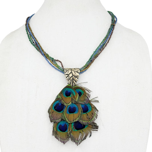 glass Seed bead & peacock feathers pendant necklace - GM1560