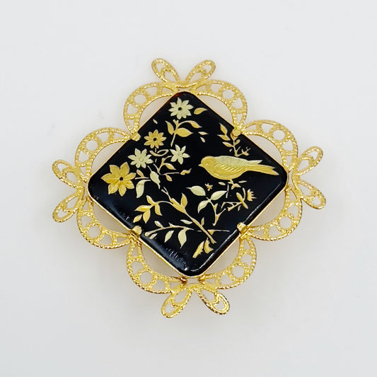 Vintage Gold Tone Damascene bird & floral brooch - GM1784