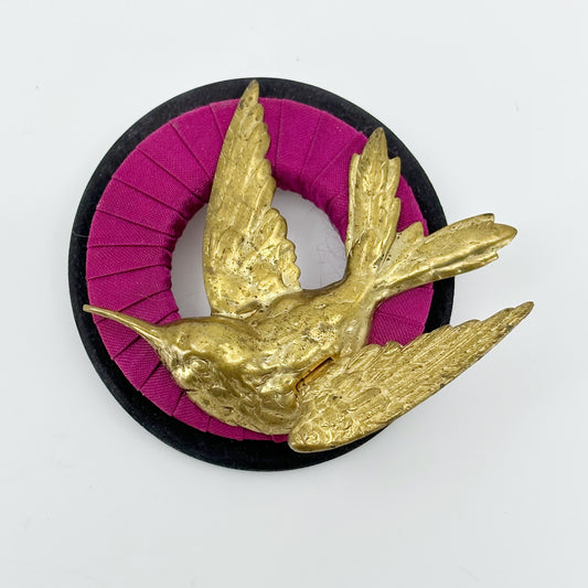 Vintage oversized hummingbird brass & textile brooch