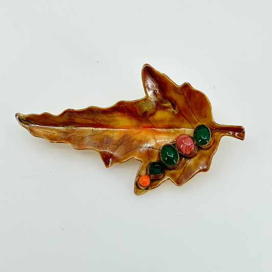 Vintage coppercraft Gemstone enamel leaf brooch