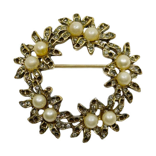 Vintage Gold Tone pearl & rhinestone floral brooch