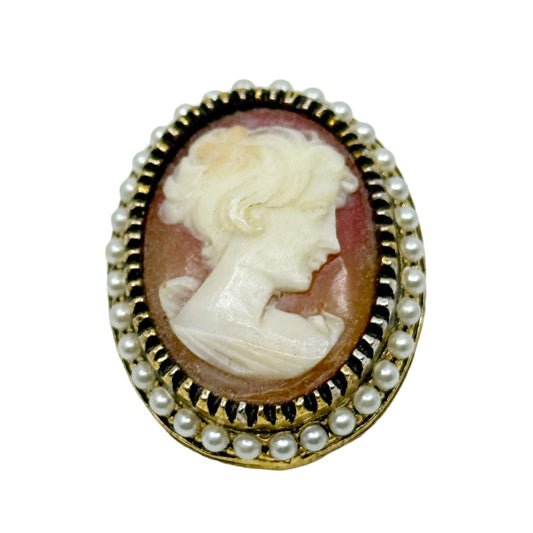 Vintage Gold tone carved cameo lucite & pearl brooch - GM494