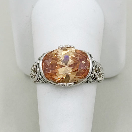 Vintage sterling silver Mediterranean coral rhinestone ring - GM194