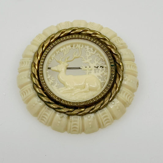 Vintage carved deer celluloid brass brooch