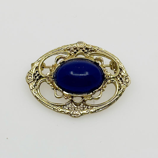 Vintage Gold tone lapis lazuli lucite cabochon brooch
