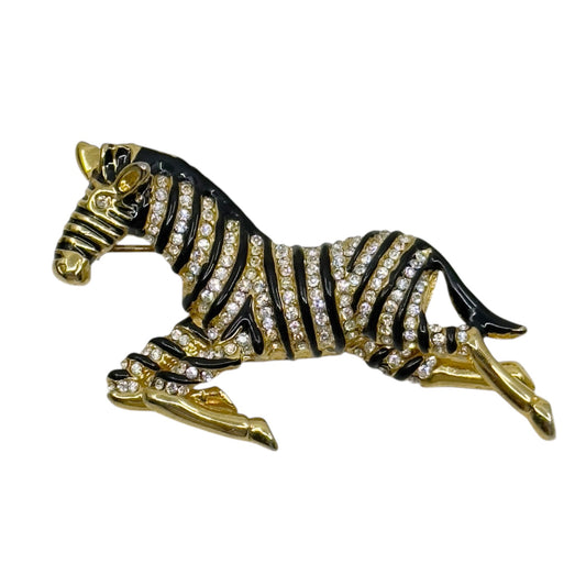 Vintage Gold Tone enamel & rhinestone zebra brooch