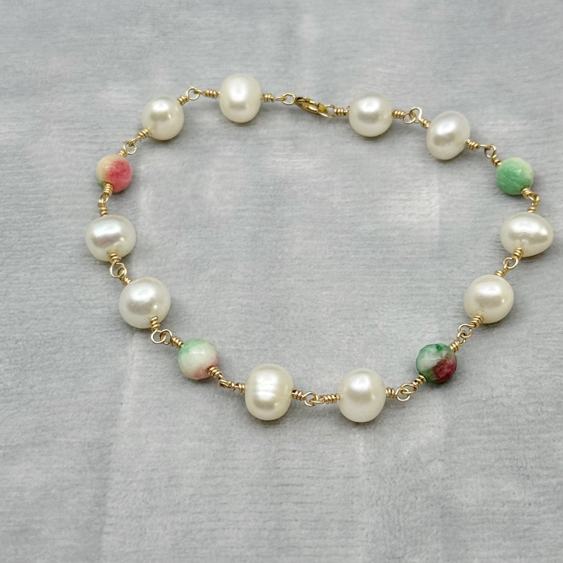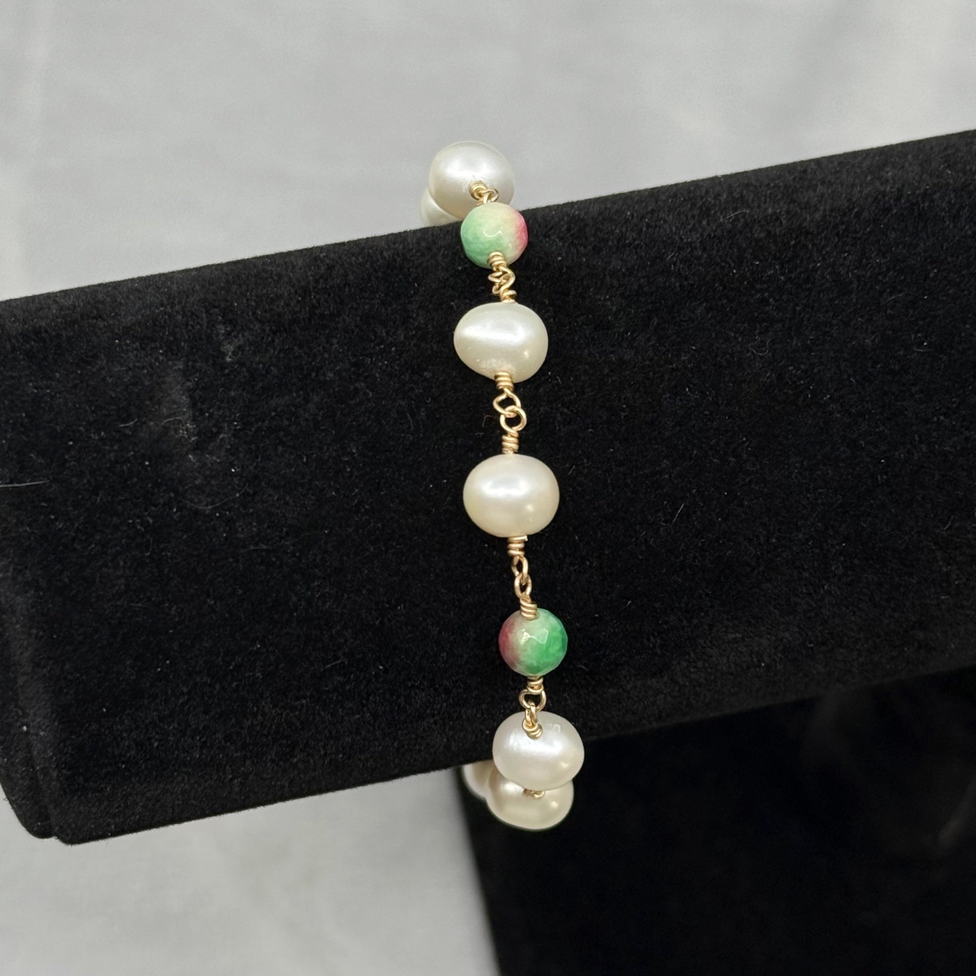 Hand Made 14k gold filled Pearl watermelon tourmaline bracelet