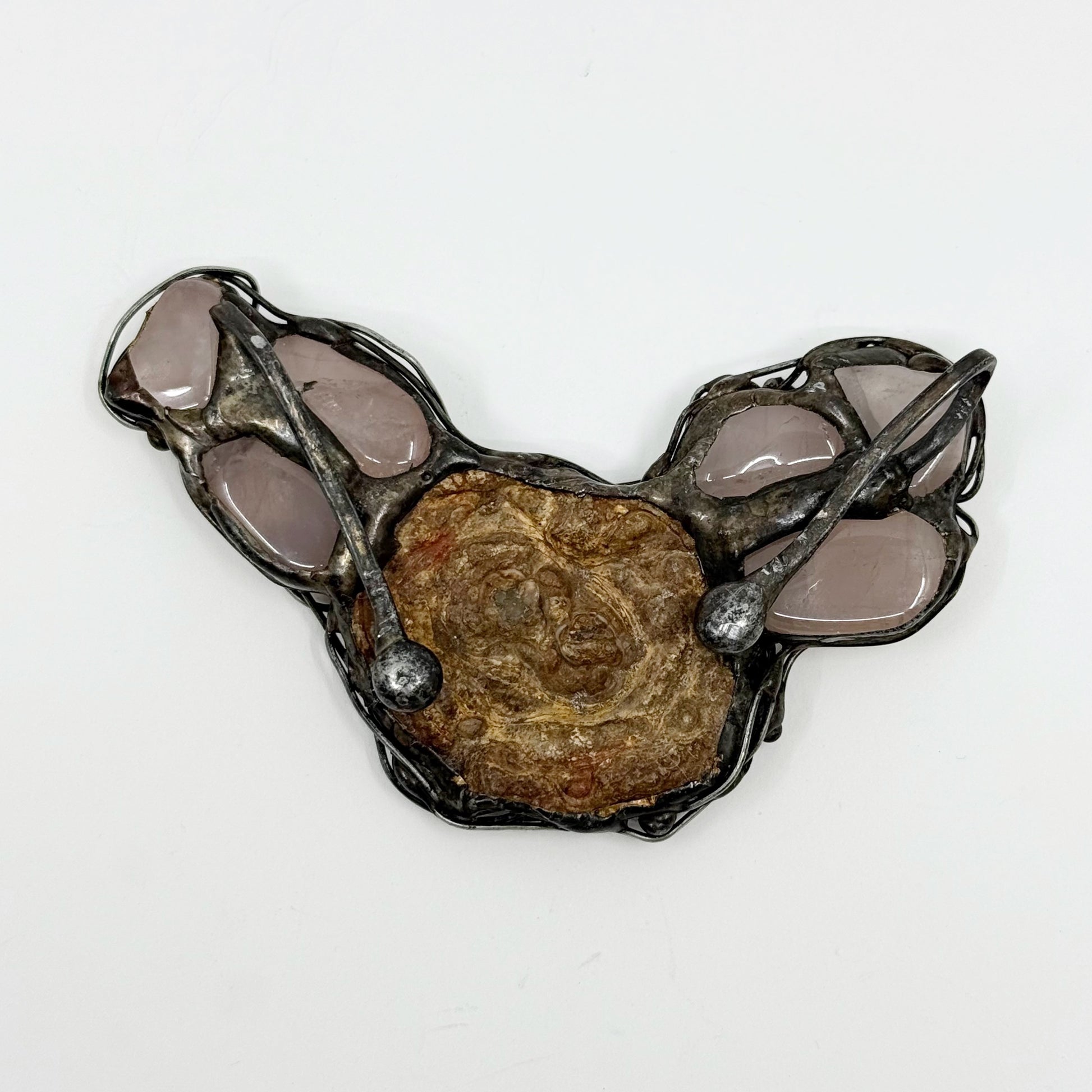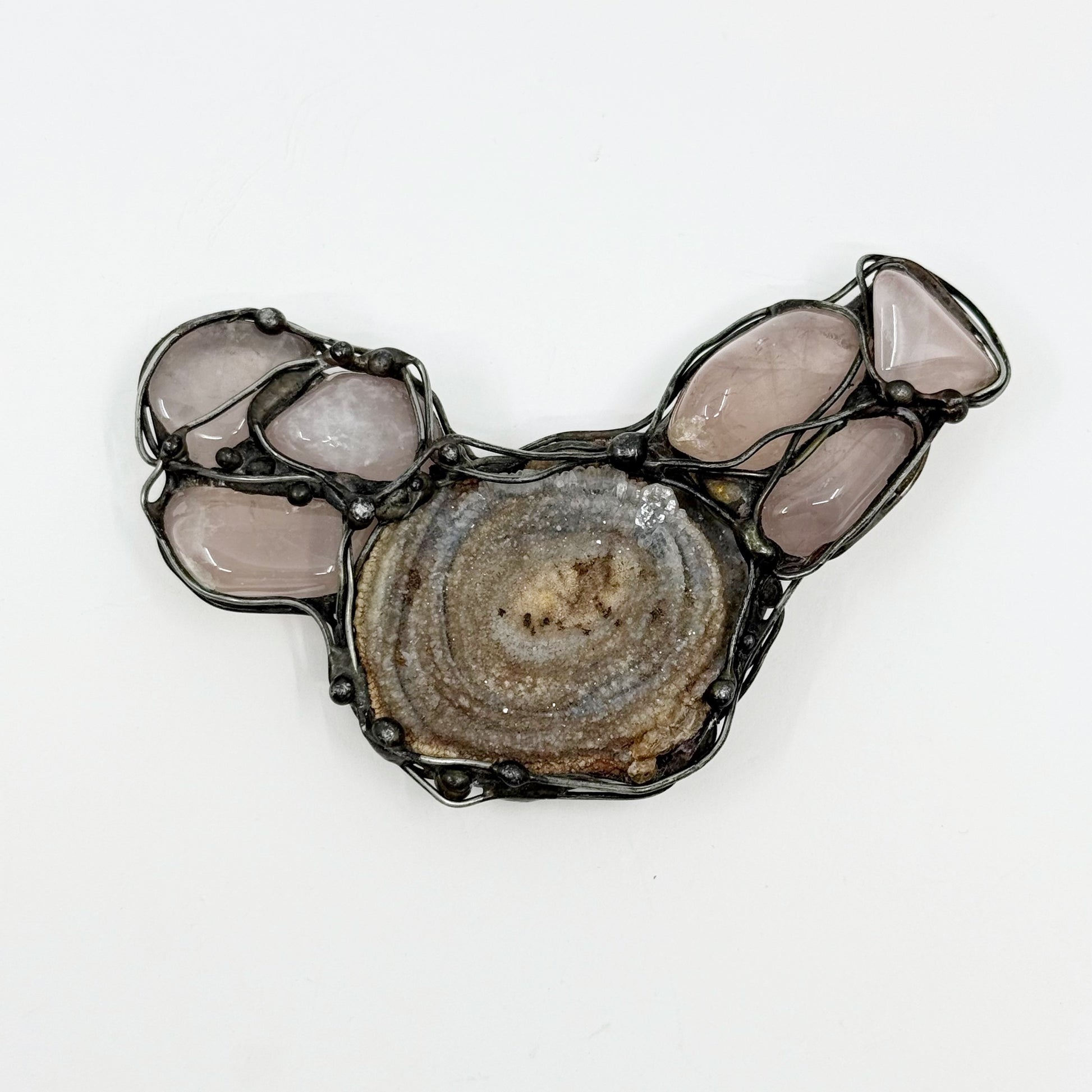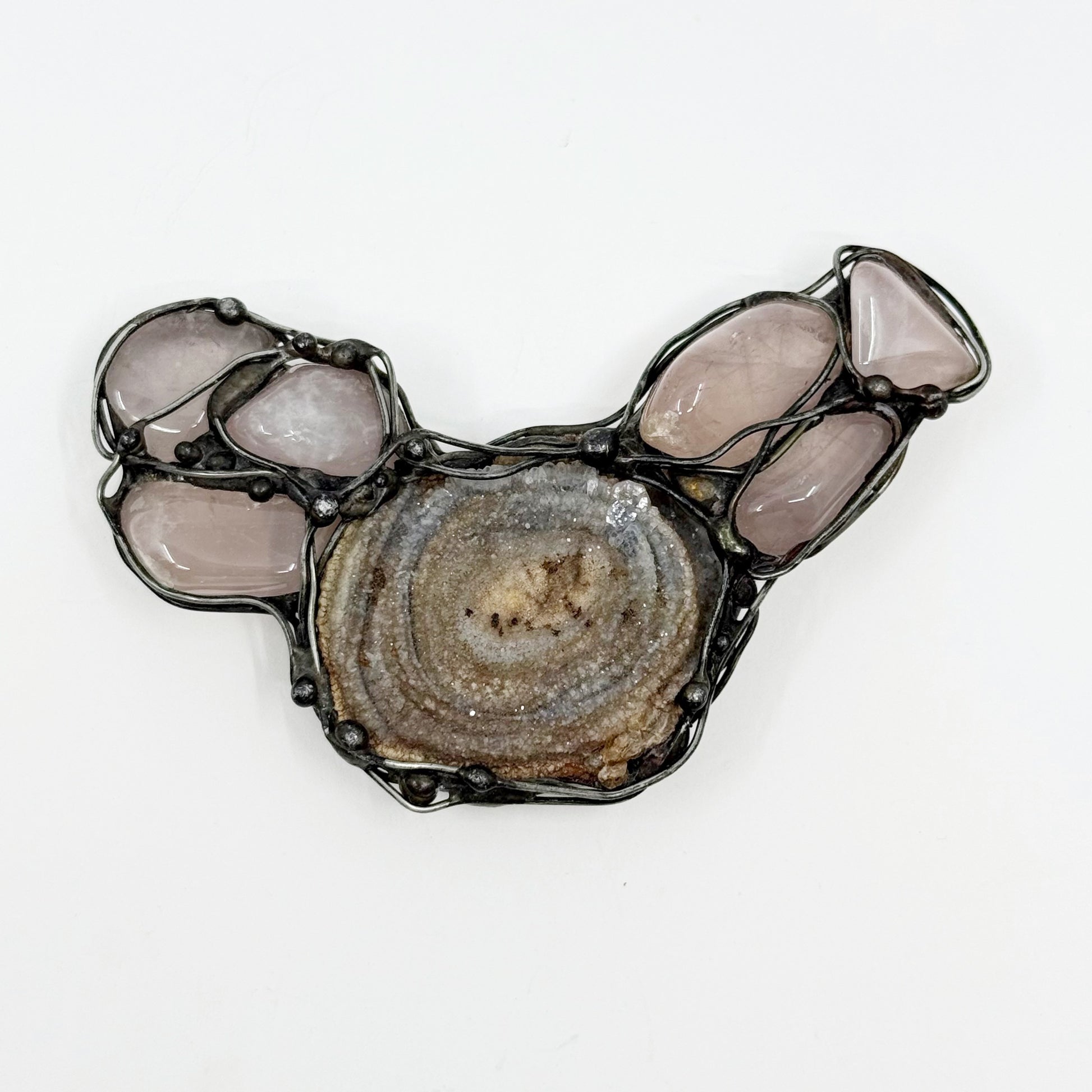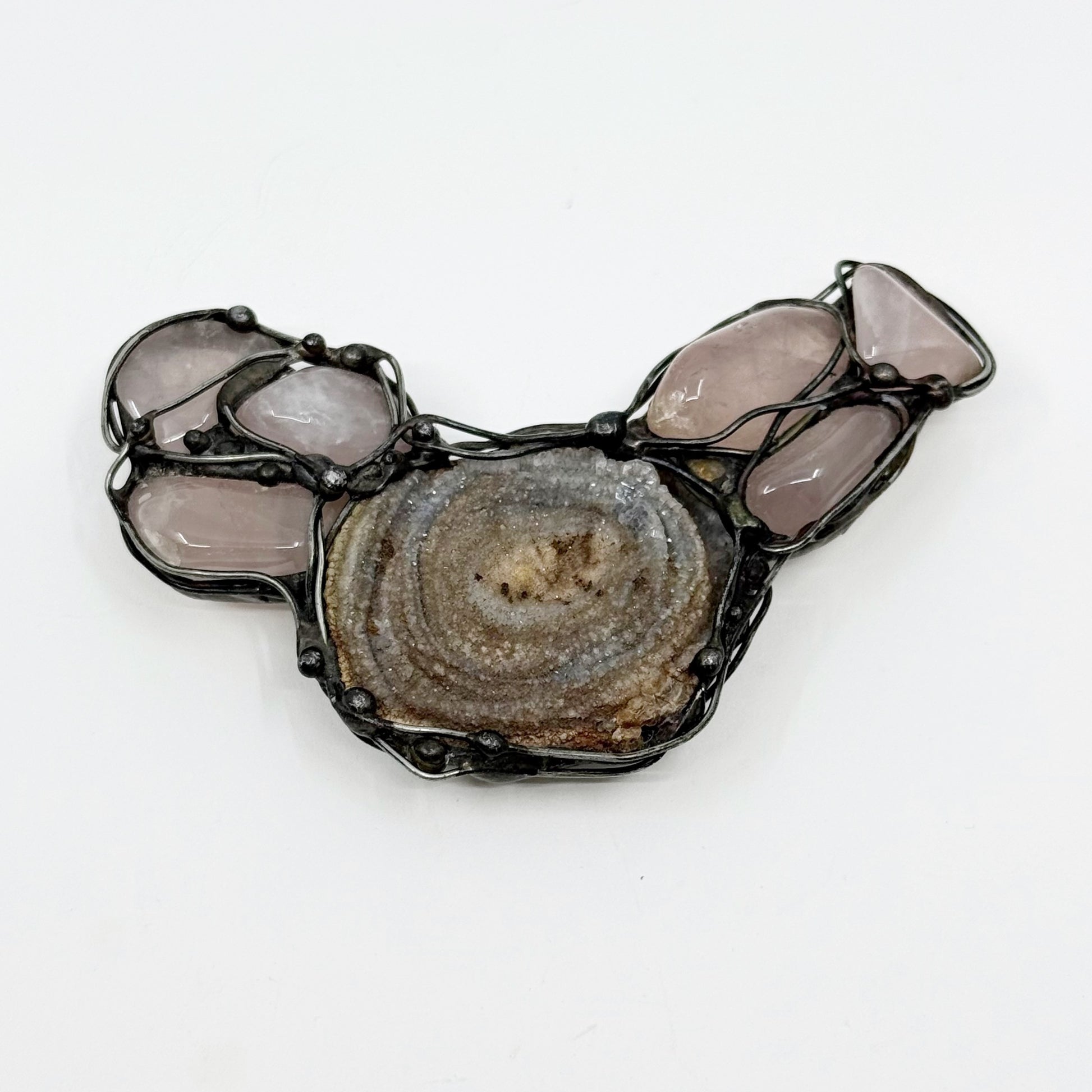Hand Made Modernist silver plated rose quartz & druzy chalcedony slide pendant GM457