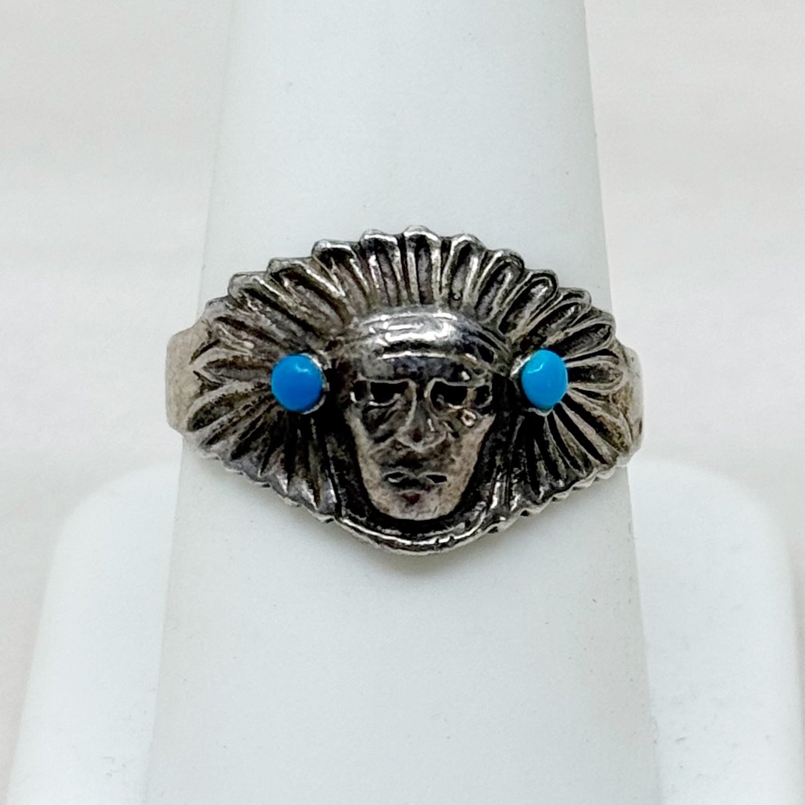 Southwest sterling silver turquoise Indian chief ring - GM283