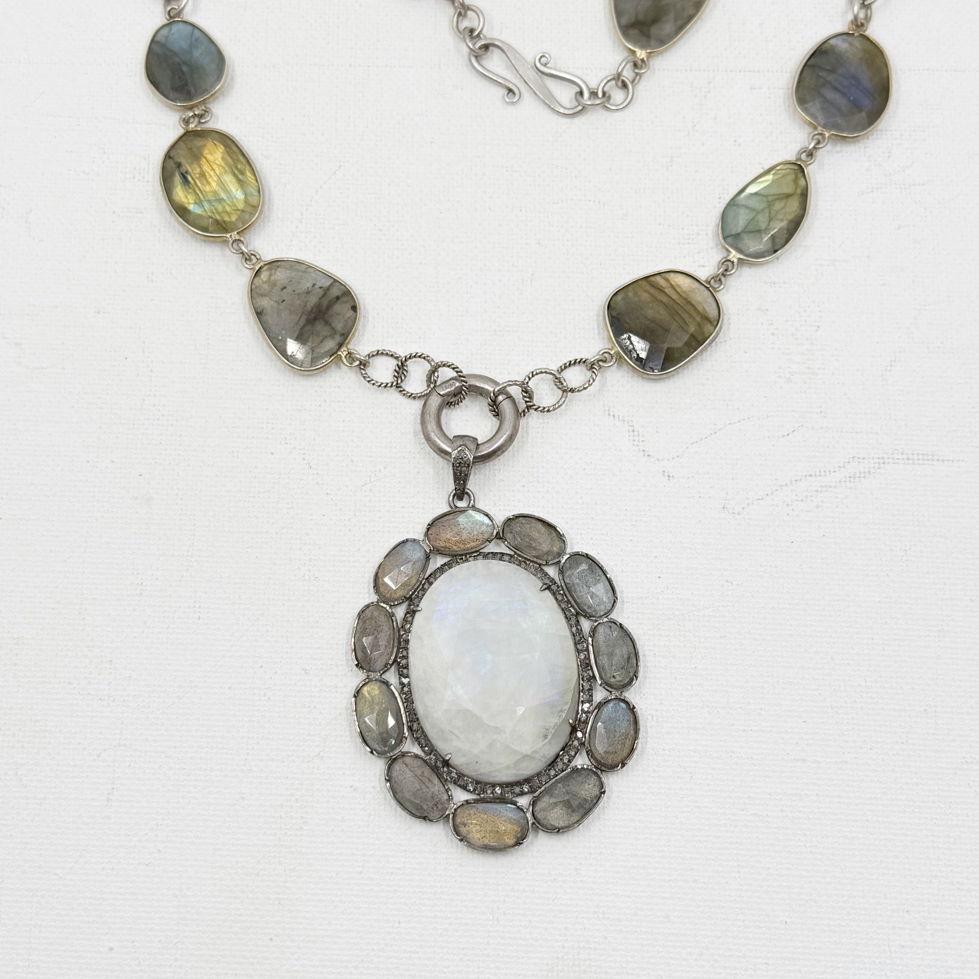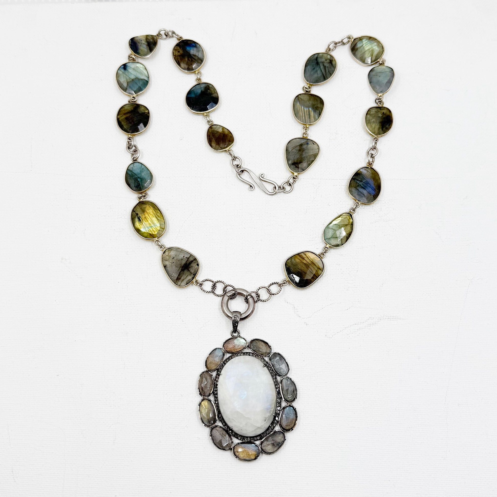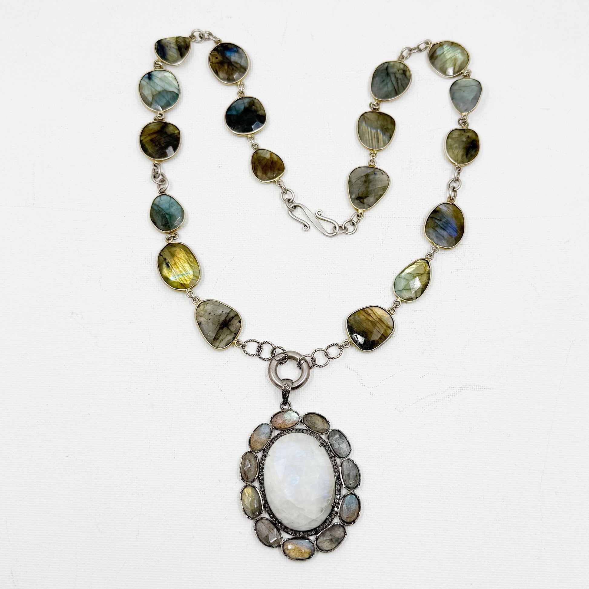 sterling silver moonstone labradorite diamond pendant necklace - GM173
