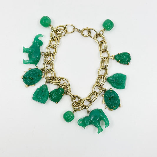 Vintage 12k Gold Filled Asian Motif elephant & Buddha jade glass bead charm bracelet - GM1566